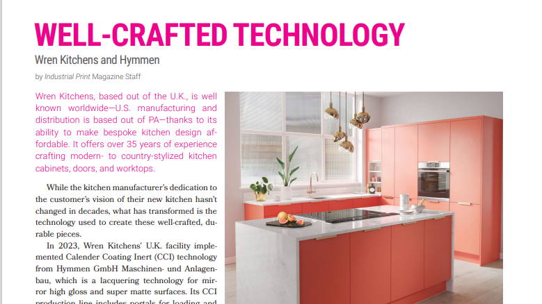 pieces. In 2023, Wren Kitchens’ U.K. facility implemented Calender Coating Inert (CCI) technology from Hymmen GmbH Maschinen- und Anlagenbau, which is a lacquering technology for mirror high gloss and super matte surfaces. Its CCI production line includes portals for loading and stacking, several transport units as well roller application machines to apply primer and base coats to MDF and/or chipboard surfaces.